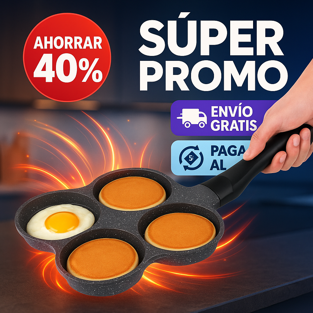 Sartén con 4 orificios, puedes cocinar perfectamente tortillas, tocino, hamburguesas, tortitas y los ingredientes que desees.